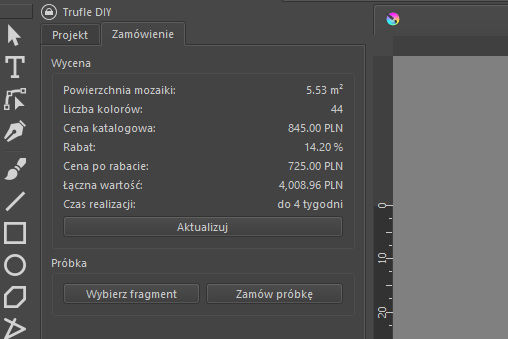 After completing your design in the Trufle DIY tool, you can navigate to the Order tab and press the Update button. At this point, Krita will connect to our server and retrieve a mosaic estimate based on the selected parameters, such as mosaic surface area, number of colors, and type of finish.